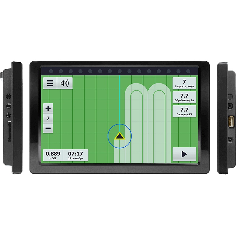 Устройство работает при любых метеоусловиях. Включает опцию параллельного вождения, установку погектарной и почасовой оплаты для механизатора, предусматривает выгрузку поля на ПК и просмотр в Гугл земле. Доступны: настройка пространства захвата (до нескольких см), определение возделанной площади, голосовые уведомления, защита сведений от редактирования.